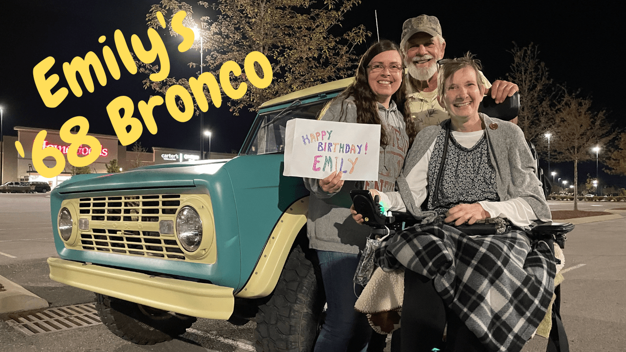 Emily’s Dad (Hogdaddy/007) came up with a little better birthday present for Emily this year than I did?!? I got to help him orchestrate his big surprise, however. We pulled it off and she was totally surprised! I filmed the entire event as he gave her his 1968 Ford Bronco that he’s had (and nicely restored) for the past 20 years.