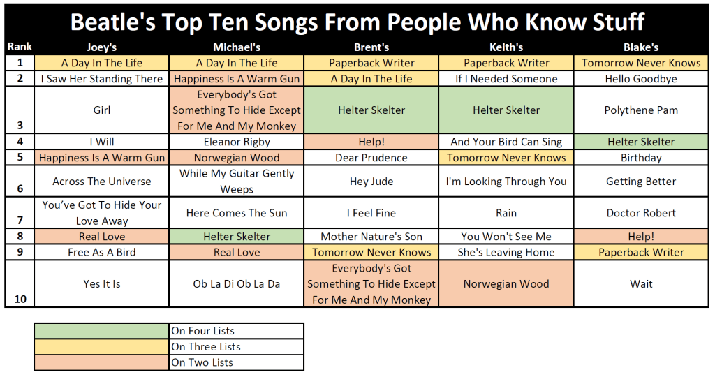 Two of us each agreed on the top song on our lists (“A Day In The Life” and “Paperback Writer”). Keith and Blake are obviously on crack for not having “A Day In The Life” anywhere on their lists. Brent and Keith must be inbred for allowing “Paperback Writer” to supplant “A Day In The Life” from the number one spot. Obviously, Michael and I are the smartest of anyone in this group.