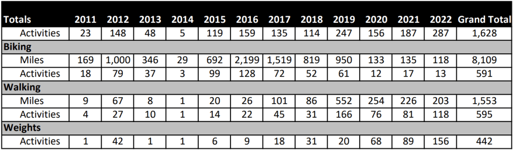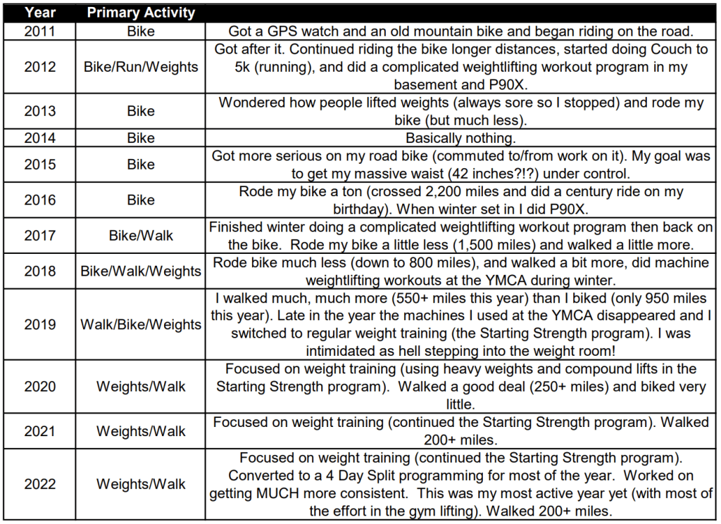 As I finish 2022, I now realize that over the years I have wasted a lot of time doing things that didn’t help me progress my health in the right direction. In 2011 when I started I wanted to lose my gut and operated under the principle of ‘use it or lose it’. This was better than the alternative (i.e. not doing anything). That said, running, biking, and using machines for weight training was all a complete waste of time. Time spent walking probably was not completely wasted but it wasn’t moving the needle. Weight training (keyword “training”) is a must-do activity.