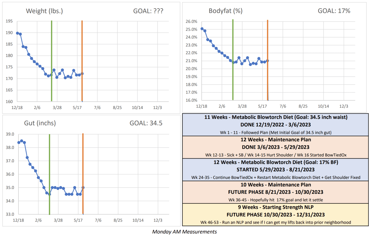 A new 12-week phase begins today and the goal is 17% body fat. From December through early March, my goal was to lose 4 inches off my gut. I wanted to get to 34.5 inches (which is half my height). I did this and hit my goal before heading off to Spring Break. In the …